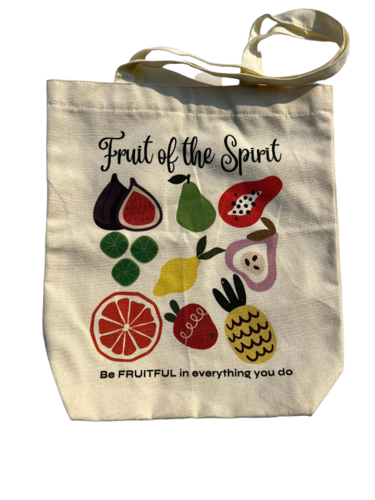 My Fruitful Life Tote - a bright and colorful tote featuring all nine Fruit of the Spirit - Love, Joy, Peace, Patience, Kindness, Goodness, Faithfulness, Gentleness and Self Control.